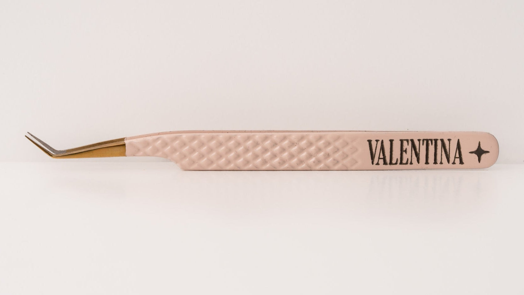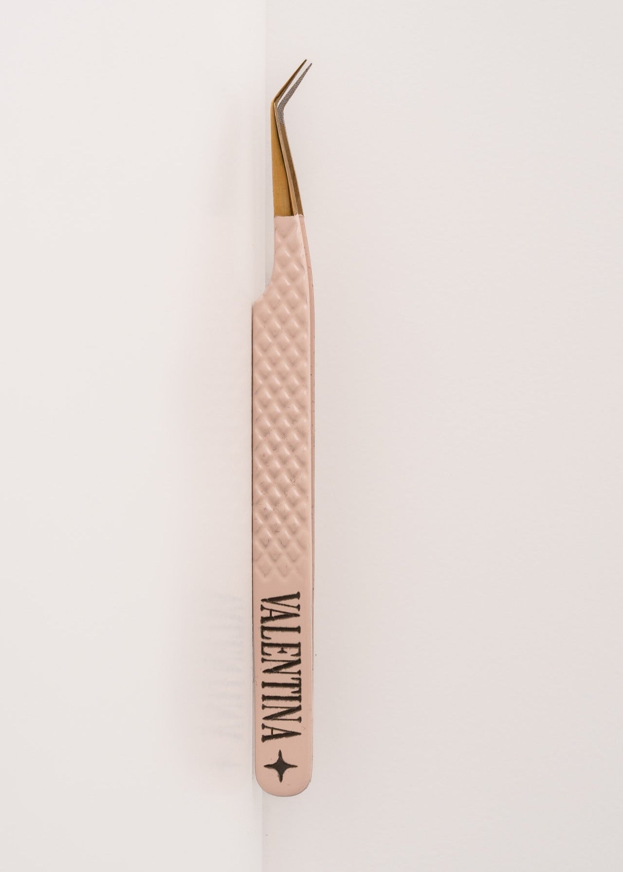 Esta pinza con ángulo de 45 grados es ideal para crear abanicos de volumen sobre las pestañas naturales. Su amplia superficie ayuda a los técnicos de pestañas a mantener el equilibrio y la sujeción al crear abanicos de volumen y megavolumen.